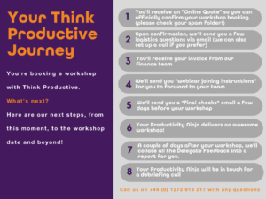 We also run One-to-One Productivity Consultancy for Business Leaders, which is a day and a half of 1-2-1 consultancy with a Senior Productivity Ninja. This is regularly described as “life changing” by our Clients, with often an immediate impact felt at home as well as at work.